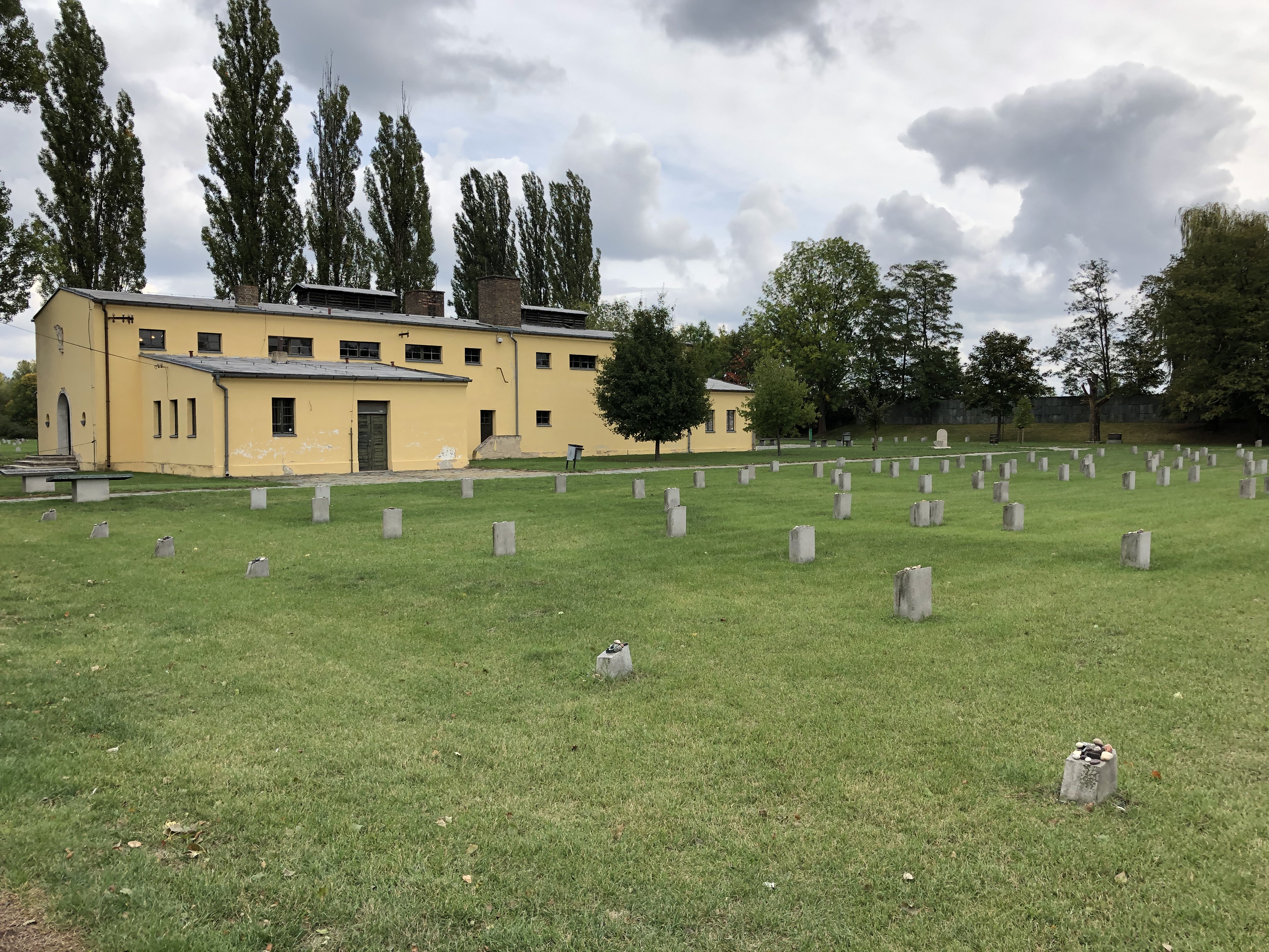 On our tour of Terezin, we saw the former barracks where old Jews were assigned to unheated stables and attics, so that they would die quickly by freezing in the winter or by heat stroke in the summer.  We saw drawings by Jewish children and drawings by Jewish professional artists, including depictions of gaunt residents waiting in line for thin soup ladled out from a barrel.  We saw the cemetery, where every morning hearses brought bodies to be dissected, cremated, and buried.  We saw the railroad tracks where newcomers arrived at Terezin and where Terezin residents were herded into cattle cars bound for extermination camps.