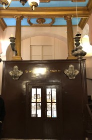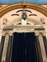 When we visit old synagogues in Europe, I always take time to decipher the phrases written in Hebrew letters over the ark or on the wall. (For my own Torah study I use the Masoretic text, which includes vowel markings (nikudim). But the words on the walls are always painted or carved without vowels, like the writing in a Torah scroll, and like modern Hebrew in Israel. I hope to get better at reading unvoweled Hebrew when we spend a month in Israel at the end of this winter.)