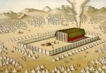 The entrance of the sanctuary tent is framed in acacia wood. Instead of a door, there is a curtain embroidered with blue, purple, and crimson yarns.2