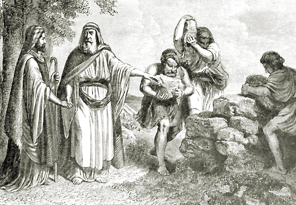 But then he gives up and proposes that he and Jacob make a formal peace treaty. Jacob raises a memorial stone and builds a cairn (a heap of stones) to mark the boundary between them. Lavan says: