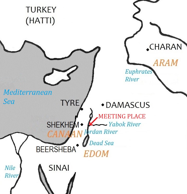 Jacob is heading for Canaan, where their parents live, not Se-ir, where Esau rules. For once he does not want what his brother has. His route to Canaan goes west along the Yabok River, then crosses the Jordan north of the Dead Sea. The hills of Se-ir are south of the Dead Sea, more than 150 miles (240 km) away from Jacob’s camp on the Yabok. If he merely continued his journey, he would be settled in Canaan long before any news of his whereabouts reached Esau.