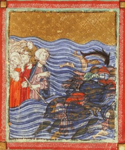Red Sea, Escape over, Golden Haggadah, c. 1320, Spain